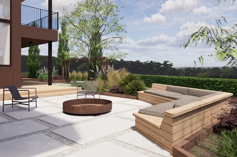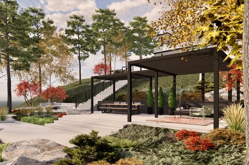 A sloped backyard was transformed to provide comfortable outdoor areas for both family and friends to relax and socialize. The design placed a strong emphasis on seamlessly connecting the indoor and outdoor areas, with large panoramic windows playing a key role in achieving this.