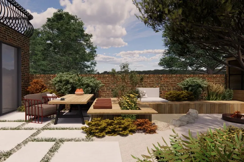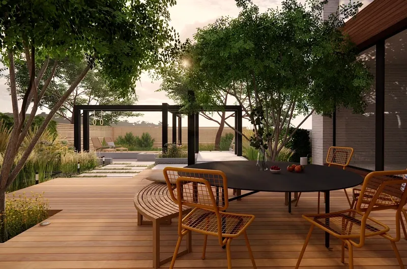 With the house embodying classic 1960s architecture, the aim was for the garden to capture the essence of that era’s aesthetic while infusing it with modern freshness and timeless elegance.