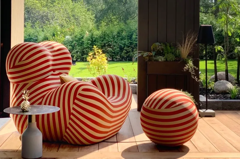 Boldness, vibrant colors, modern design, and a hint of oriental flair were the defining elements of the residents' style. Their aspiration was to create a summer kitchen ideal for passionate chefs, a private outdoor lounge space, and an additional element that would harmonize with their modern, stylish home.