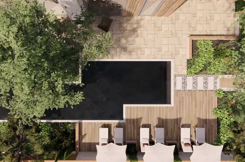 The pool area seamlessly integrates with the natural surroundings, surrounded by oasis-like planting areas. With a selection of durable and low-maintenance plants, the lush look is maintained year-round.