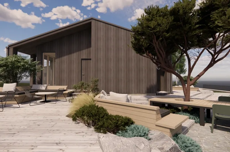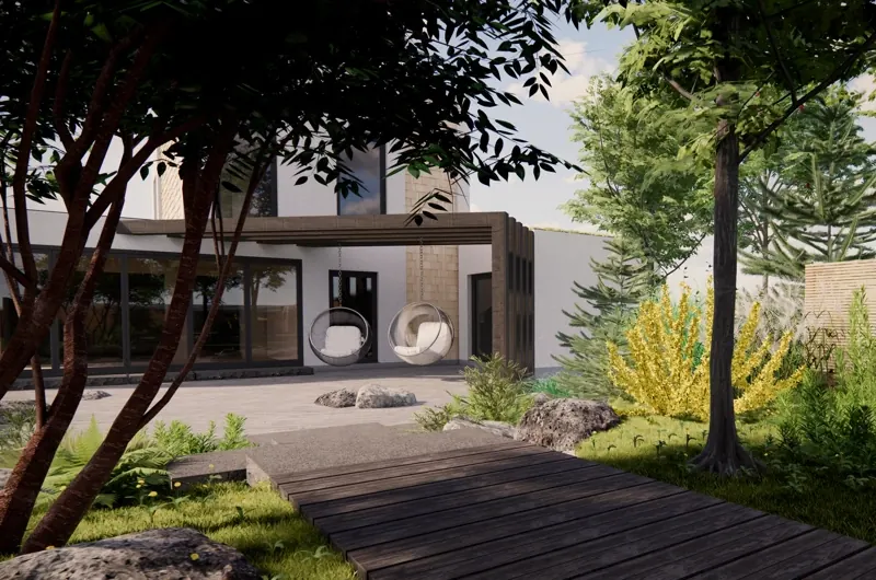 The compact yard of the new development was designed to incorporate lush greenery and evoke a modern villa ambiance. Through 3D renderings, the vision for the garden’s style and atmosphere was clearly conveyed even before the formal building permit process commenced.